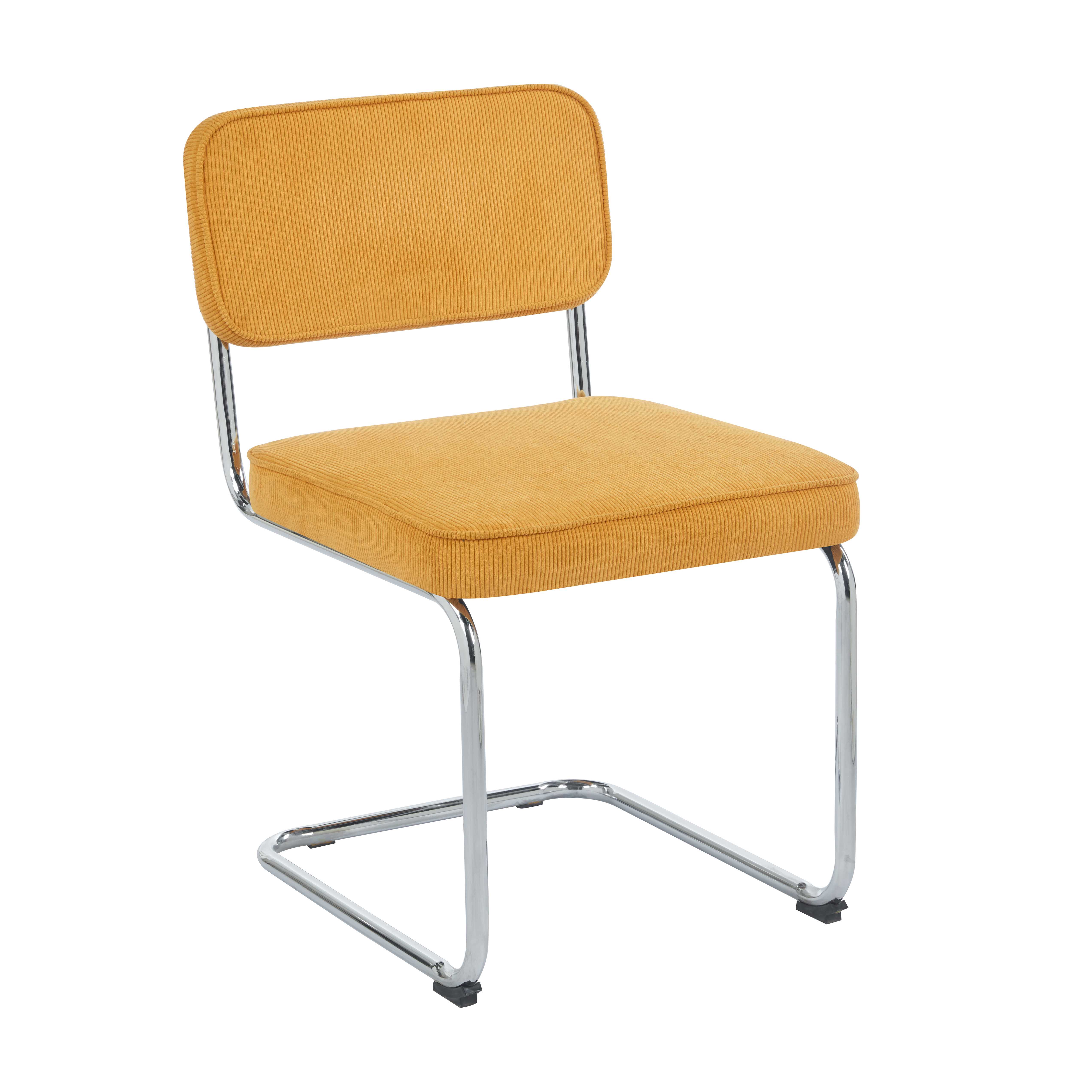 The chair features a square backrest and a wide, thick seat cushion, with clean lines and a simple overall design. The frame is made of shiny chrome-plated metal tubing, which is sturdy and durable while offering slight flexibility for comfortable support. The seat and backrest are wrapped in corduroy fabric with delicate vertical textures, adding visual depth. This chair is perfect for use in dining rooms, lounges, cafes, or even office spaces.¥ 0.00Buy now