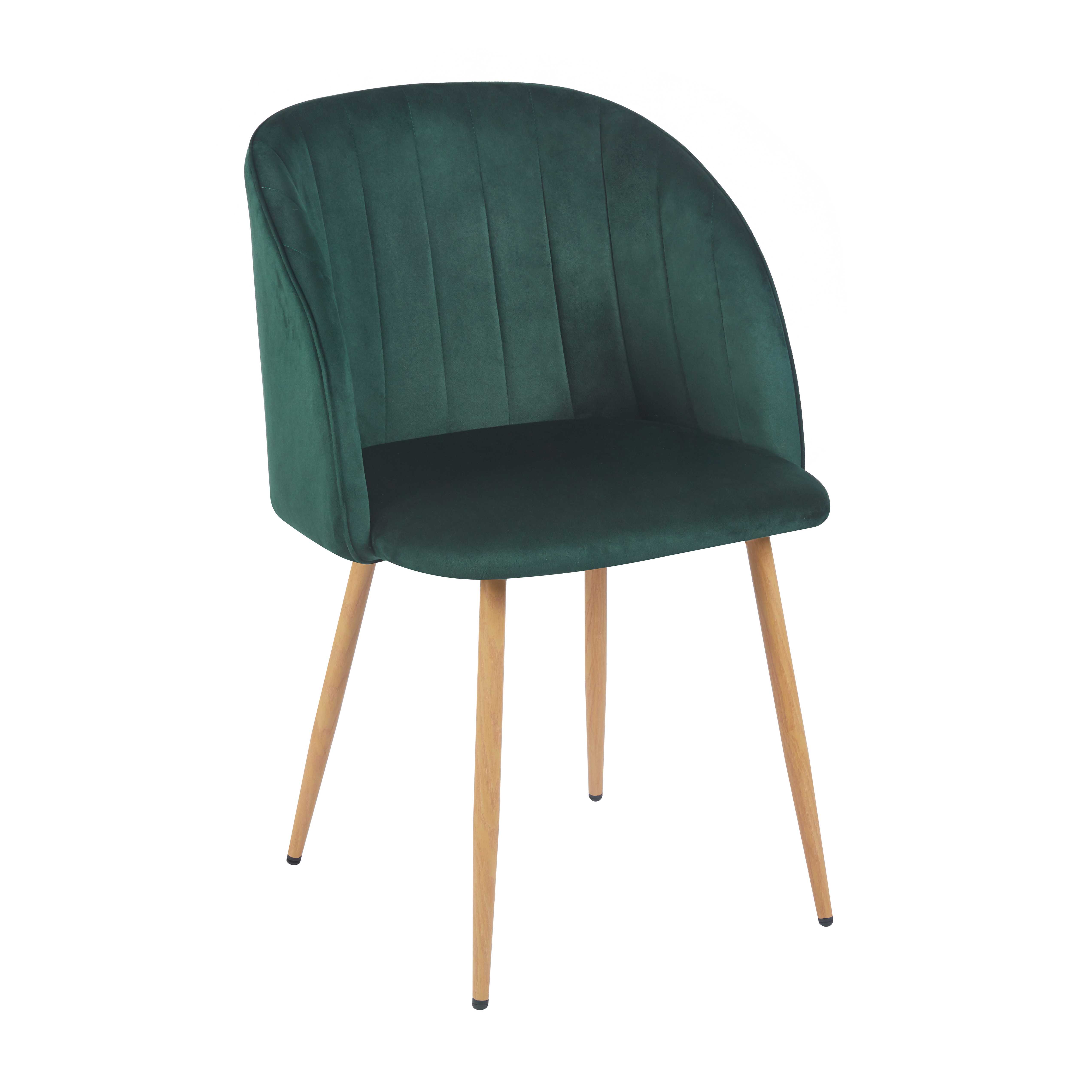 The chair features a deep green velvet material with smooth lines on the backrest and seat. The backrest is curved with vertical pleated textures. The four legs are made of light-colored wood, tapering into slender shapes with black non-slip pads at the bottom. The overall design is minimalist and stylish, combining comfort with aesthetics.¥ 0.00Buy now