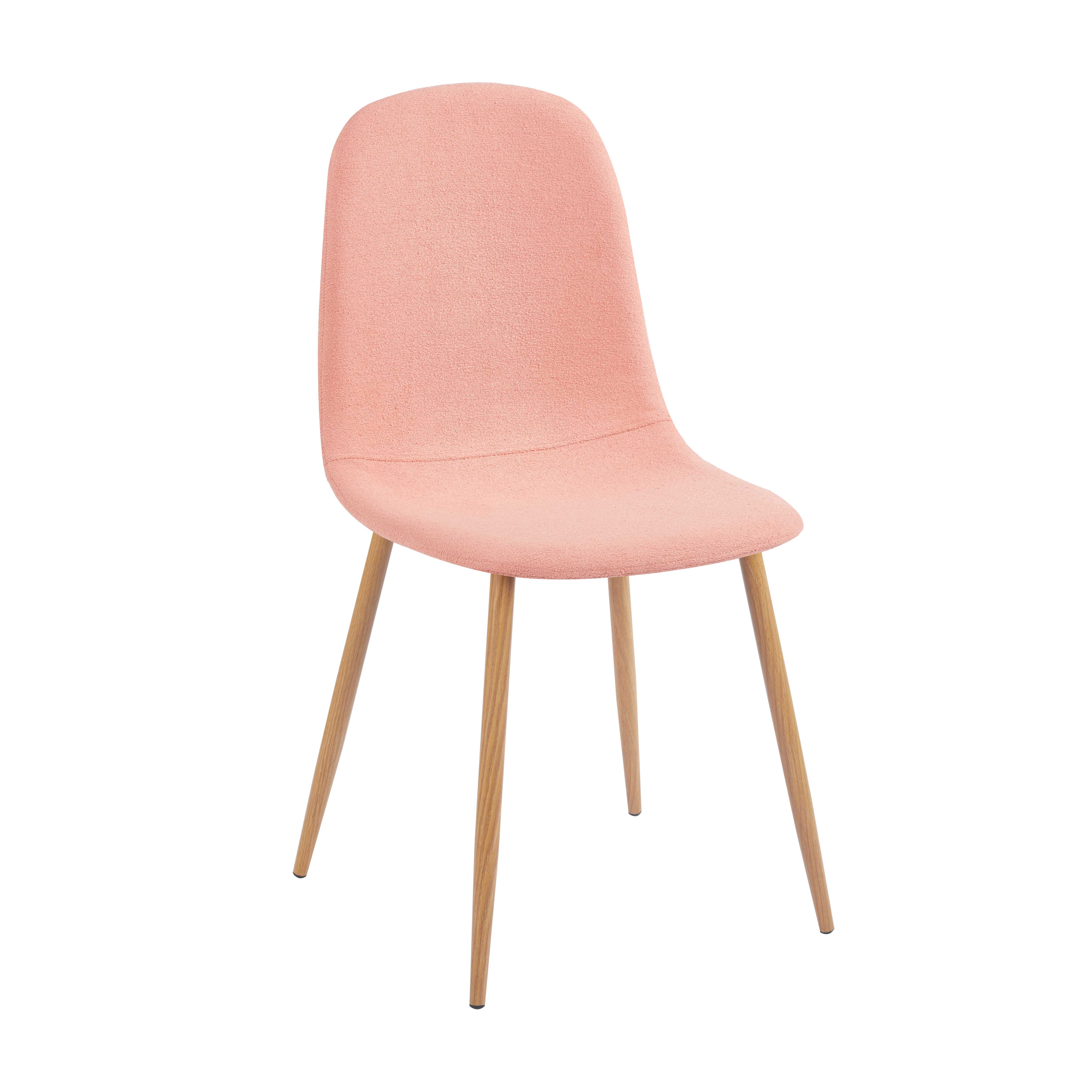This is a minimalist-style dining chair. The backrest and seat are integrated in design, covered with a soft pink-orange fabric that likely feels soft and comfortable to the touch. The legs are made of wood in a light brown color, splayed outward for a simple yet stable appearance. The overall design is clean and elegant, with warm colors that suit a variety of home décor styles.¥ 0.00Buy now
