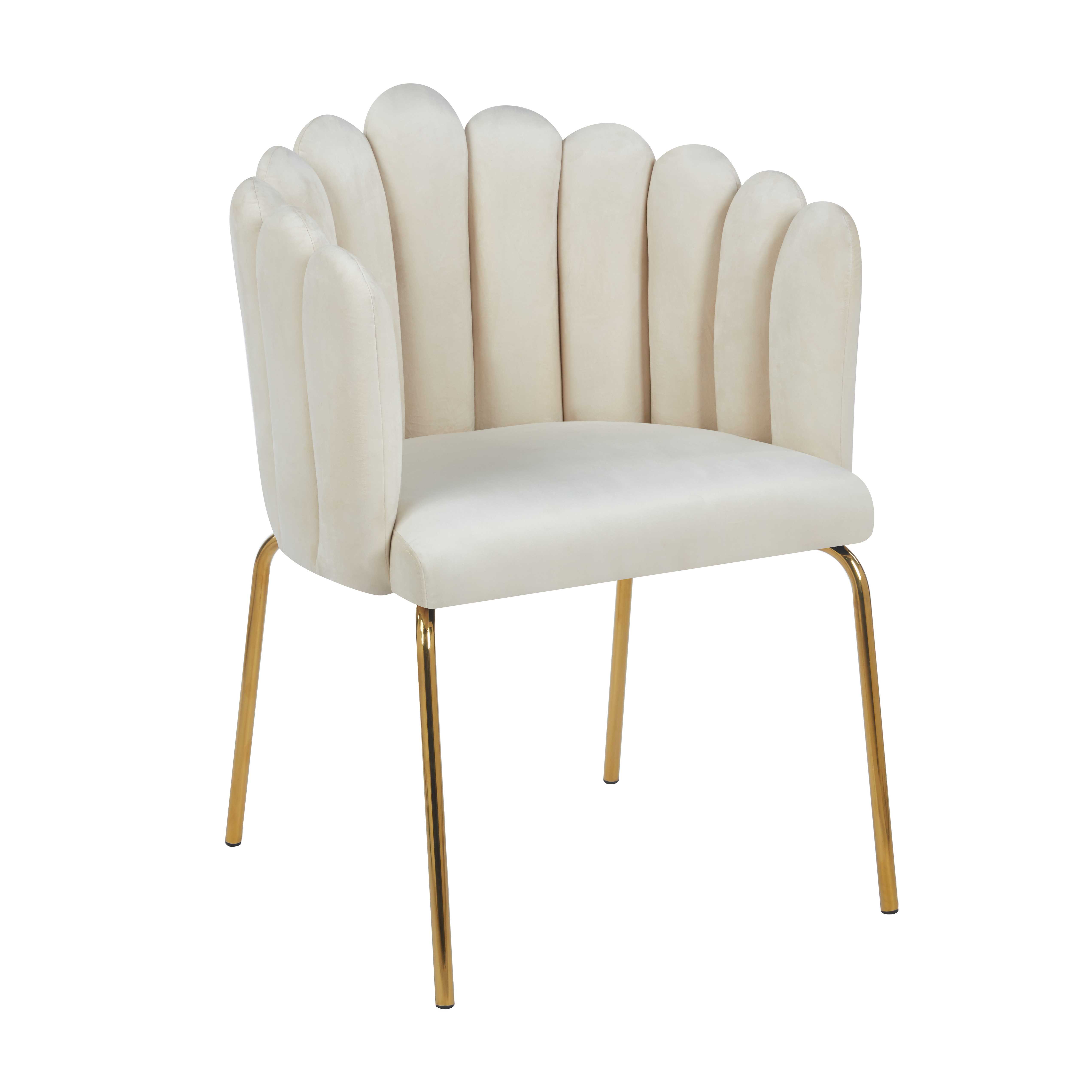 This is a modern and elegant dining chair, inspired by a seashell design. The backrest features a scalloped arc shape, adding visual depth and artistic flair. The seat and backrest are upholstered in soft velvet fabric, offering a comfortable and luxurious sitting experience. The metal legs are finished with a gold coating, providing both stability and a stylish touch. It is perfect for pairing with various dining tables or as an accent chair.¥ 0.00Buy now